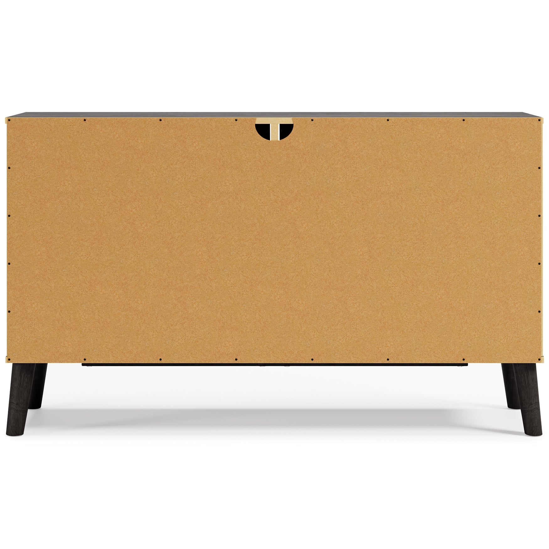 The perfect marriage of simple and contemporary style, this dresser is a charming addition to your home. It features an expressive two-tone look, with a dark charcoal finish over replicated oak grain with an authentic touch and a replicated sugarberry wood grain. Ball-bearing glides offer smooth opening and closing of the drawers, while matte black knobs and splay legs add a finishing touch.
